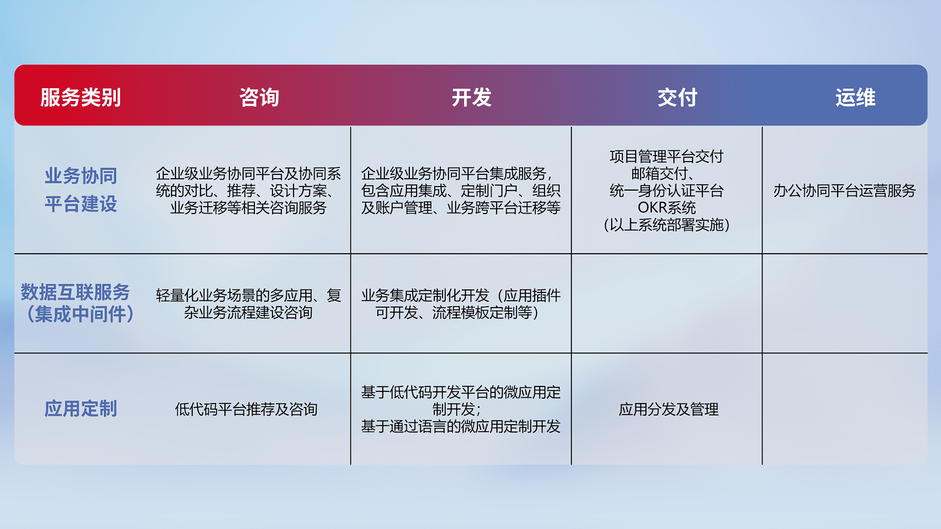 针对钉钉、、、企微、、、、IDaas等平台级产品提供产品的规划、、、、方案、、交付、、定制化开发等服务,,实现如统一协同办公、、、、智能客户服务、、、混合会议管理、、、、智能数据查询、、、等业务场景,,,实现数字化转型。。。