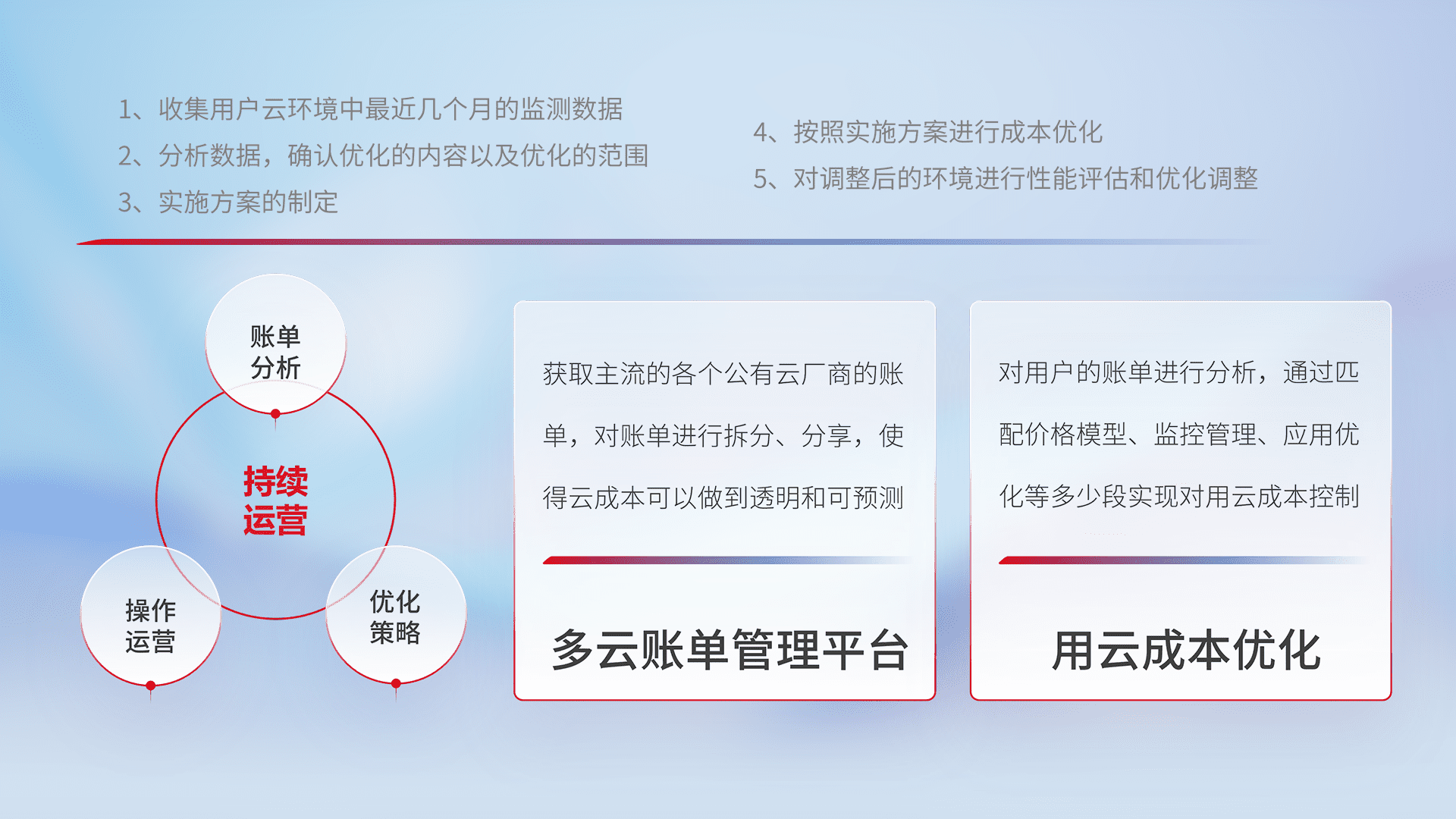 通过多云纳管,,,以统一的资源数据模型把客户的云资源进行抽象和封装,,进而实现对多云资源的统一操作,,保障云资源管理的可靠性、、、稳定性与可用性。。。。量身定制化运维内容,,,,配置、、、开发运维、、补丁管理、、备份、、、、监控、、、认证和访问管理、、、审计和日常巡检等,,,保障在用云过程中的可靠度,,,稳定度以及高可用率。。